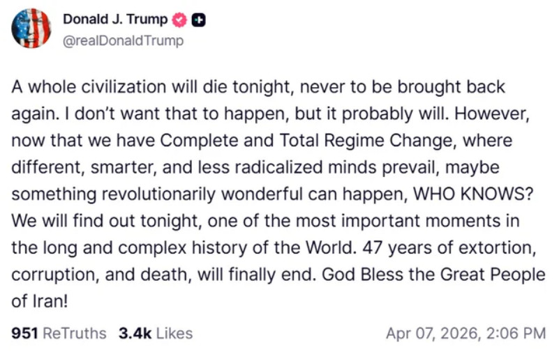 In previous weeks, President Trump has signaled extensions days or hours in advance, often pairing threats with claims that “negotiations are going well.” Not today. Trump has confirmed to the press that “8:00 P.M. is happening,” and the rhetoric has shifted from military strategy to the promised erasure of a “whole civilization.”